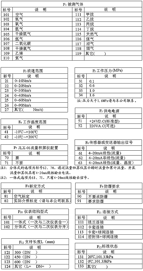 上面的选型表示:采用插入式,卡套安装。测量介质为空气,流速范围为0~40Nm/s,工作压力为0.6MPa,工作温度为-10℃~+100℃,供电电源为24VDC,要显示(瞬时流量和累计流量),用空气标定,无防爆要求,结构为分体式,采用3/4"NPT卡套连接方式,支杆长度为300mm(现场管道的口径为200mm),流量单位的标准状态为20℃,